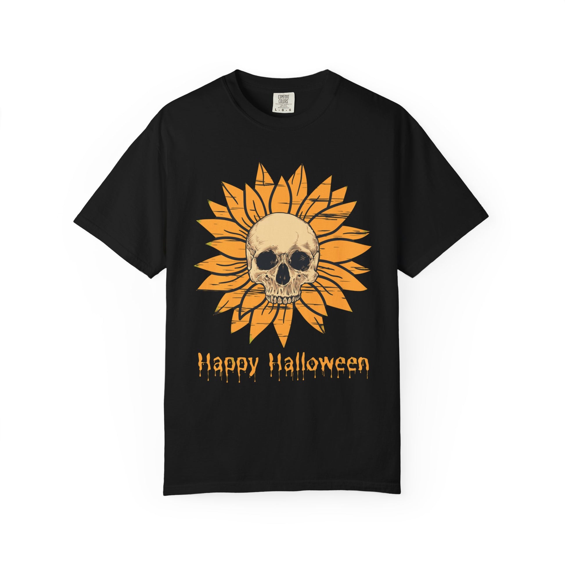Embrace the season with this uniquely designed unisex garment-dyed t-shirt featuring a striking Halloween-themed graphic. The vibrant colors and artistic skull within a sunflower create a playful and spooky vibe, perfect for Halloween festivities. This relaxed-fit t-shirt is made of 100% ring-spun cotton, ensuring maximum comfort whether you're out trick-or-treating, hosting a Halloween party, or simply enjoying cozy fall days at home. Its garment-dyed fabric provides a soft texture that you'll love to wear again and again. Ideal for anyone looking to add a touch of seasonal flair to their wardrobe, this t-shirt is a great gift for friends and family celebrating Halloween or fall events. With 58 color options, you're sure to find the perfect match for your personal style!